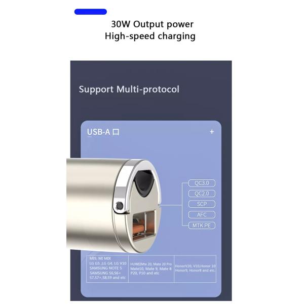Metal material design Usb Cell Phone Car Charger with PPS fast charging and the urgent charging power.